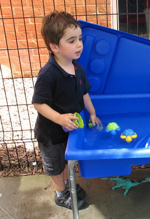 We did lots of fun things...we went to the football field to play ball and stroll around the track, DeeDee taught you 'No More Monkies Jumping on the Bed' and you learned some of the motions, you 'painted' the building with water (and got wet enough that you needed a new set of clothes), your daddy came to visit and feed you lunch, you took a good nap, and enjoyed your snacks. However, the highlight of your day was getting to play at the water table...what a fun way to begin the summer!!